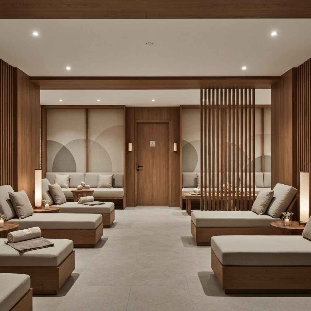 Зоны ресепшн, лаунжи и раздевалки. Влагостойкие материалы и спортивный дизайн.